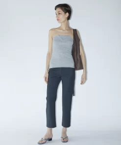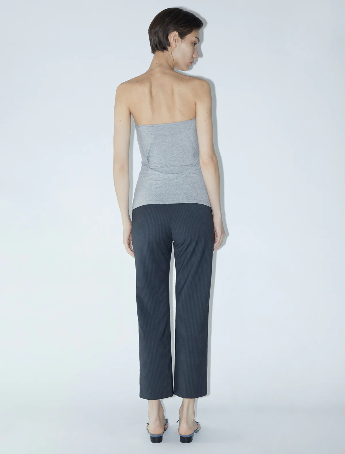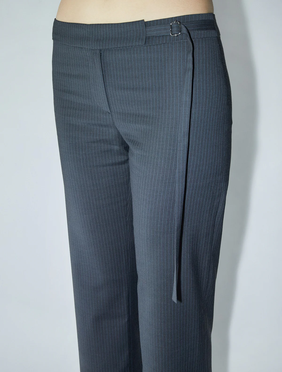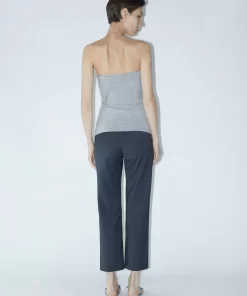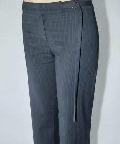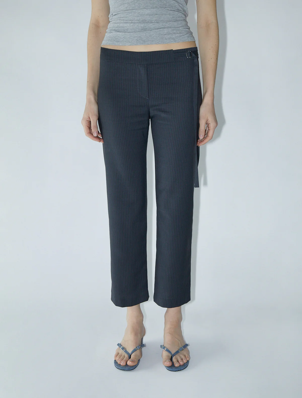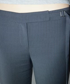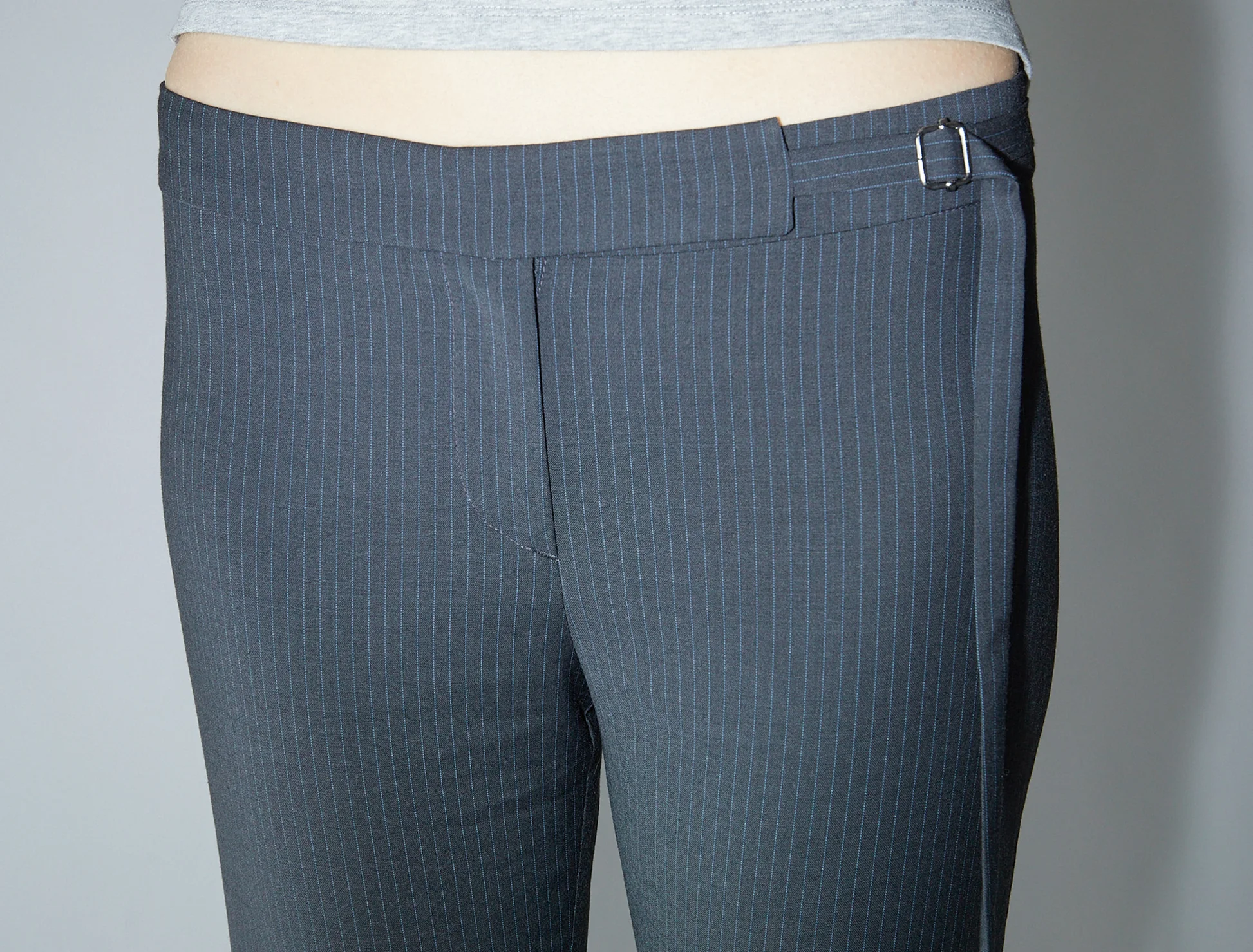 Regular straight-leg capri pants, with a tie detail at the waistband.Fabric: Our traditional suit material with a fine and delicate blue pinstripe.Color dark grey.Made in Spain.Ref. UV3804Fabric