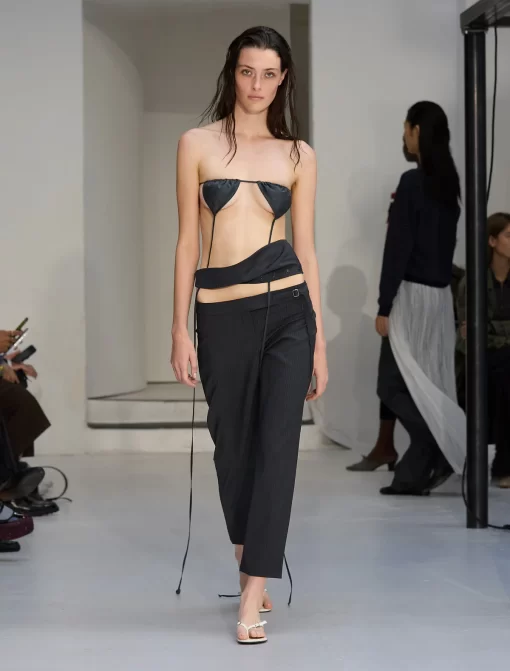 Regular straight-leg capri pants, with a tie detail at the waistband.Fabric: Our traditional suit material with a fine and delicate blue pinstripe.Color dark grey.Made in Spain.Ref. UV3804Fabric